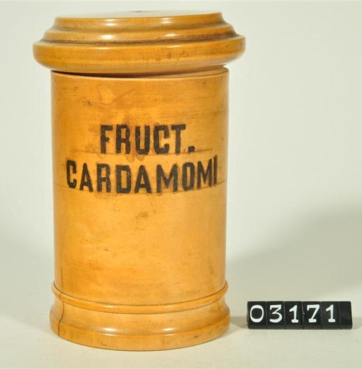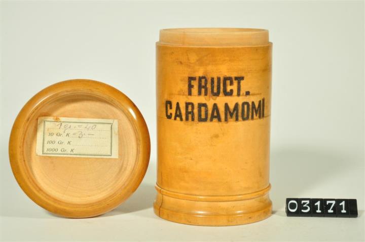Hellbraune, zylinderförmige Holzdose (Holzbüchse) mit abgesetztem Standfuß bestehend aus Halbrundstab, Kehlung und geradem Abschluss. Flacher Stülpdeckel mit gerundetem Deckelrand und darüber zwei Kehlungen. Schwarz signiert