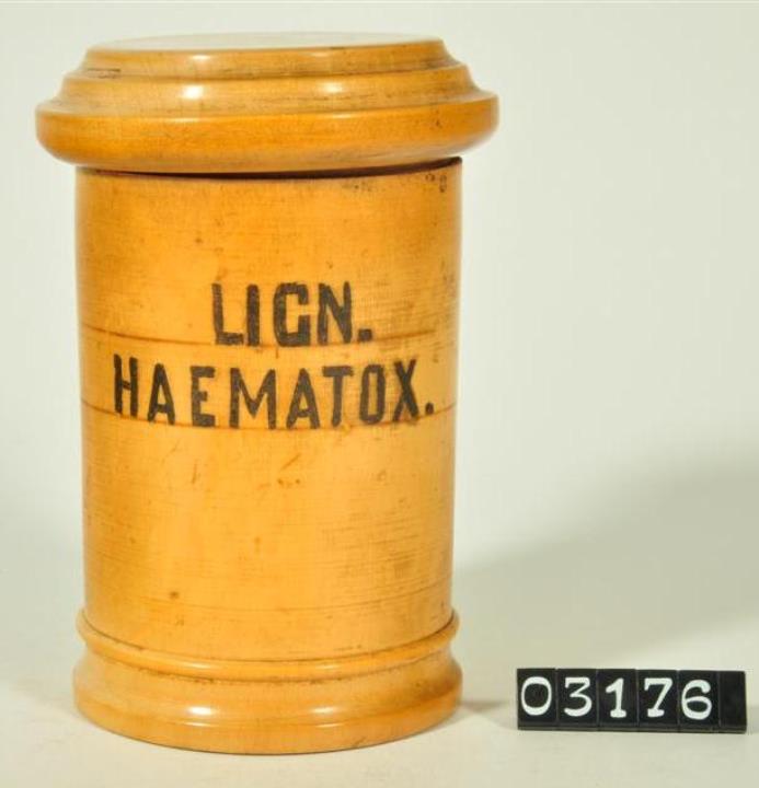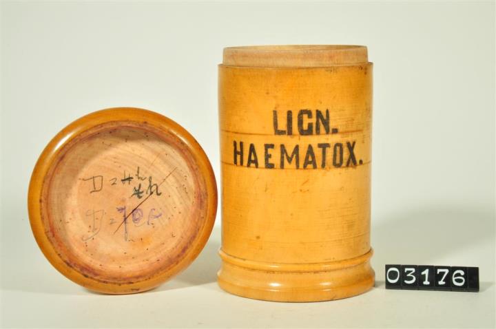Hellbraune, zylinderförmige Holzdose (Holzbüchse) mit abgesetztem Standfuß bestehend aus Halbrundstab, Kehlung und geradem Abschluss. Flacher Stülpdeckel mit gerundetem Deckelrand und darüber zwei Kehlungen. Schwarz signiert
