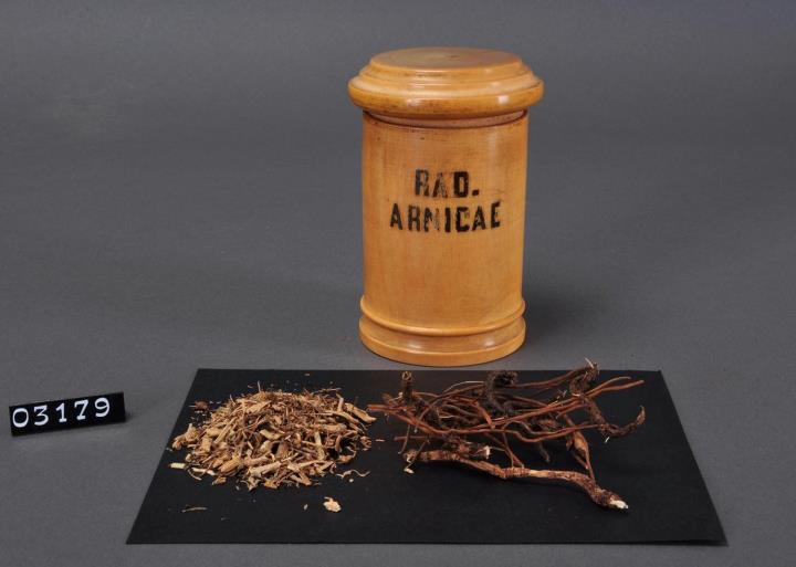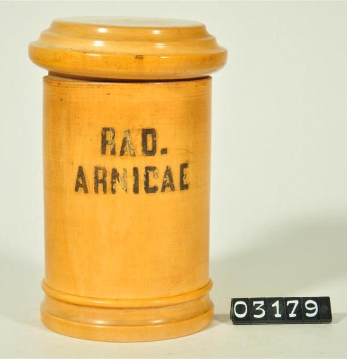 Hellbraune, zylinderförmige Holzdose (Holzbüchse) mit abgesetztem Standfuß bestehend aus Halbrundstab, Kehlung und geradem Abschluss. Flacher Stülpdeckel mit gerundetem Deckelrand und darüber zwei Kehlungen. Schwarz signiert. Enthält Arnikawurzel geschnitten.