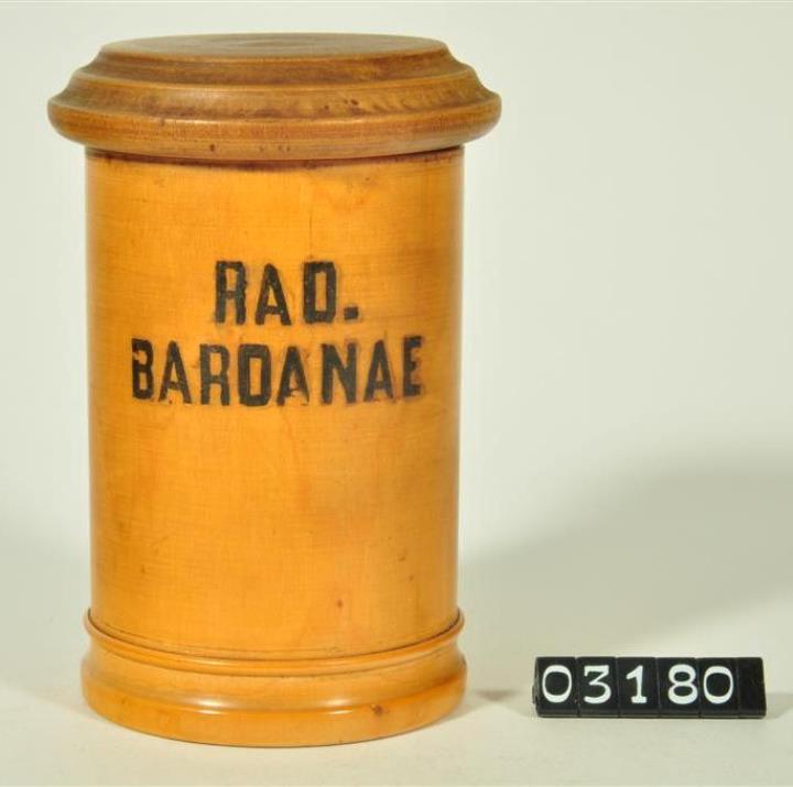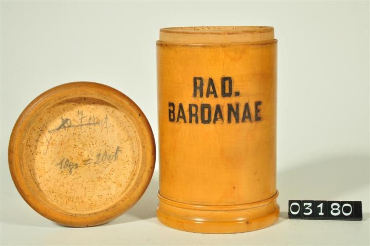 Hellbraune, zylinderförmige Holzdose (Holzbüchse) mit abgesetztem Standfuß bestehend aus Halbrundstab, Kehlung und geradem Abschluss. Flacher Stülpdeckel mit gerundetem Deckelrand und darüber zwei Kehlungen. Schwarz signiert