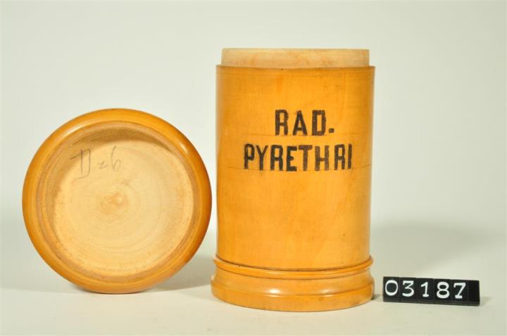 Hellbraune, zylinderförmige Holzdose (Holzbüchse) mit abgesetztem Standfuß bestehend aus Halbrundstab, Kehlung und geradem Abschluss. Flacher Stülpdeckel mit gerundetem Deckelrand und darüber zwei Kehlungen. Schwarz signiert