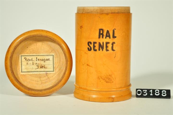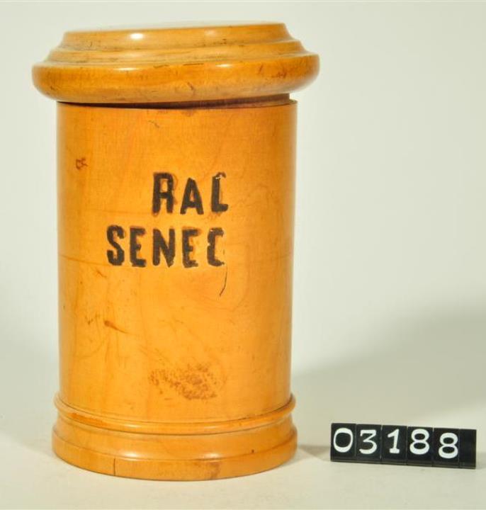 Hellbraune, zylinderförmige Holzdose (Holzbüchse) mit abgesetztem Standfuß bestehend aus Halbrundstab, Kehlung und geradem Abschluss. Flacher Stülpdeckel mit gerundetem Deckelrand und darüber zwei Kehlungen. Schwarz signiert