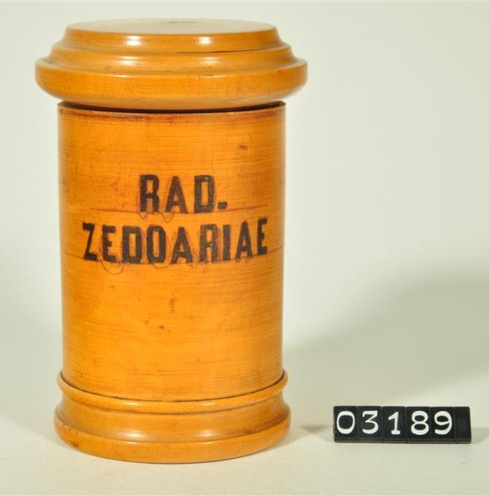 Hellbraune, zylinderförmige Holzdose (Holzbüchse) mit abgesetztem Standfuß bestehend aus Halbrundstab, Kehlung und geradem Abschluss. Flacher Stülpdeckel mit gerundetem Deckelrand und darüber zwei Kehlungen. Schwarz signiert