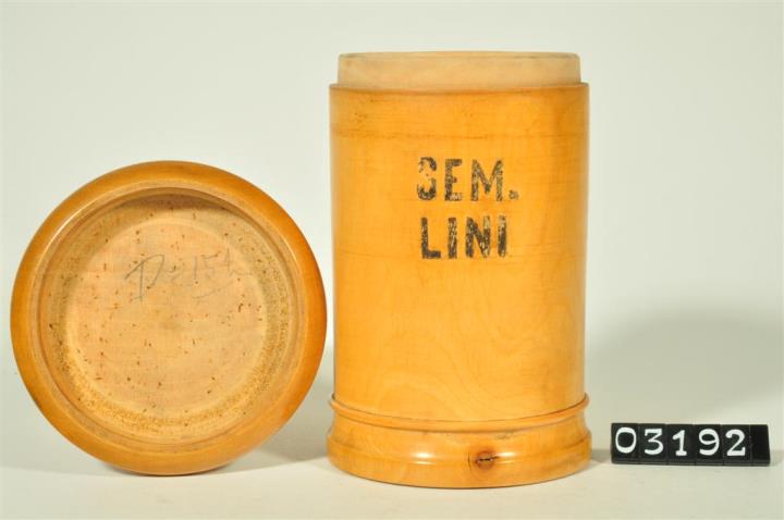 Hellbraune, zylinderförmige Holzdose (Holzbüchse) mit abgesetztem Standfuß bestehend aus Halbrundstab, Kehlung und geradem Abschluss. Flacher Stülpdeckel mit gerundetem Deckelrand und darüber zwei Kehlungen. Schwarz signiert