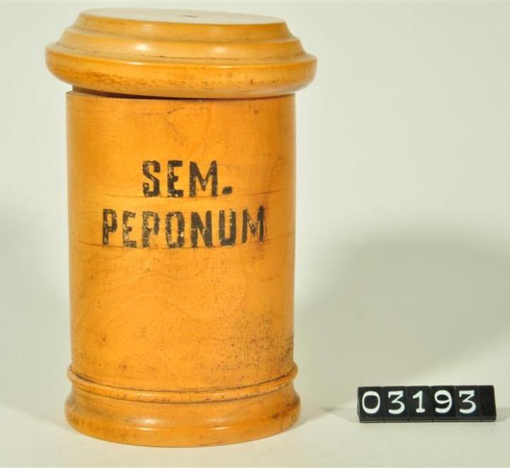 Hellbraune, zylinderförmige Holzdose (Holzbüchse) mit abgesetztem Standfuß bestehend aus Halbrundstab, Kehlung und geradem Abschluss. Flacher Stülpdeckel mit gerundetem Deckelrand und darüber zwei Kehlungen. Schwarz signiert