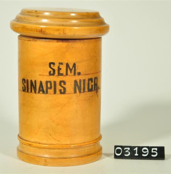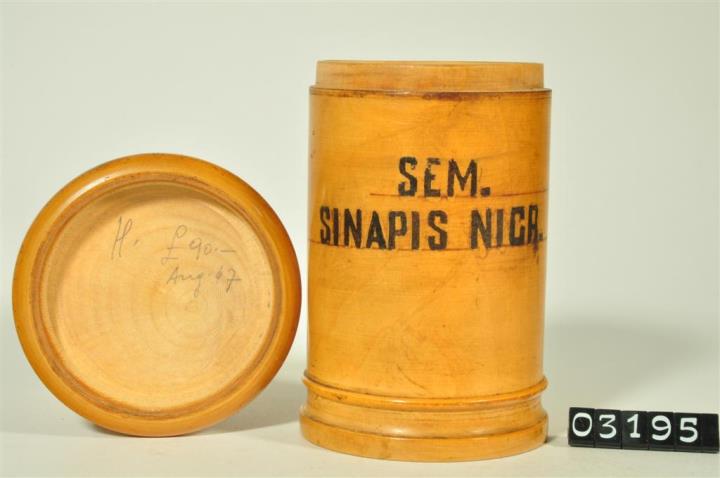 Hellbraune, zylinderförmige Holzdose (Holzbüchse) mit abgesetztem Standfuß bestehend aus Halbrundstab, Kehlung und geradem Abschluss. Flacher Stülpdeckel mit gerundetem Deckelrand und darüber zwei Kehlungen. Schwarz signiert