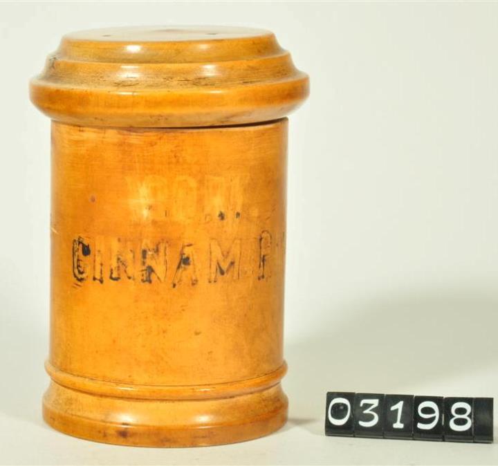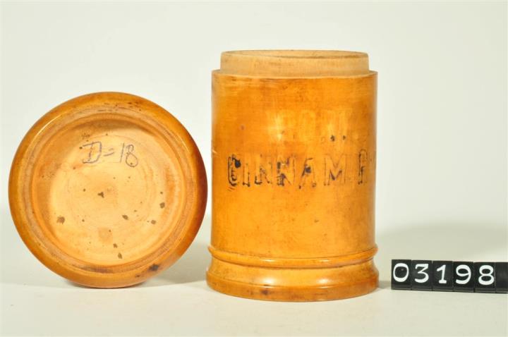 Hellbraune, zylinderförmige Holzdose (Holzbüchse) mit abgesetztem Standfuß bestehend aus Halbrundstab, Kehlung und geradem Abschluss. Flacher Stülpdeckel mit gerundetem Deckelrand und darüber zwei Kehlungen. Schwarz signiert