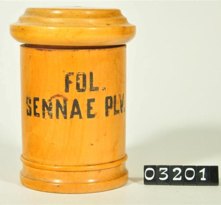 Hellbraune, zylinderförmige Holzdose (Holzbüchse) mit abgesetztem Standfuß bestehend aus Halbrundstab, Kehlung und geradem Abschluss. Flacher Stülpdeckel mit gerundetem Deckelrand und darüber zwei Kehlungen. Schwarz signiert