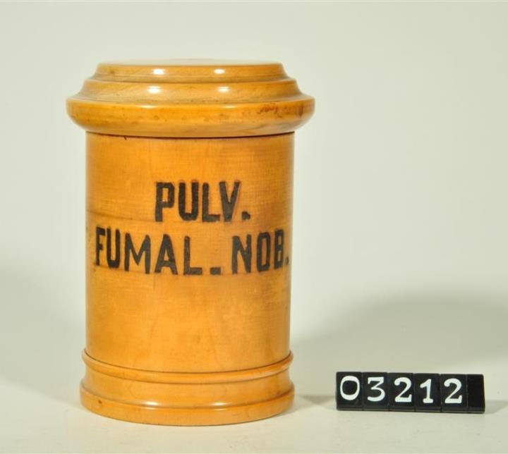 Hellbraune, zylinderförmige Holzdose (Holzbüchse) mit abgesetztem Standfuß bestehend aus Halbrundstab, Kehlung und geradem Abschluss. Flacher Stülpdeckel mit gerundetem Deckelrand und darüber zwei Kehlungen. Schwarz signiert