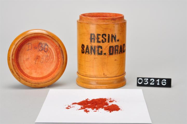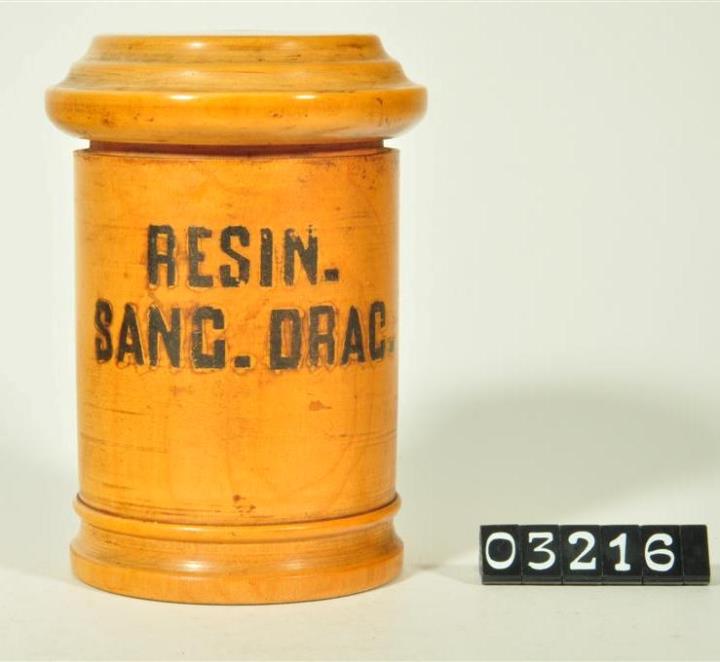 Hellbraune, zylinderförmige Holzdose (Holzbüchse) mit abgesetztem Standfuß bestehend aus Halbrundstab, Kehlung und geradem Abschluss. Flacher Stülpdeckel mit gerundetem Deckelrand und darüber zwei Kehlungen. Schwarz signiert