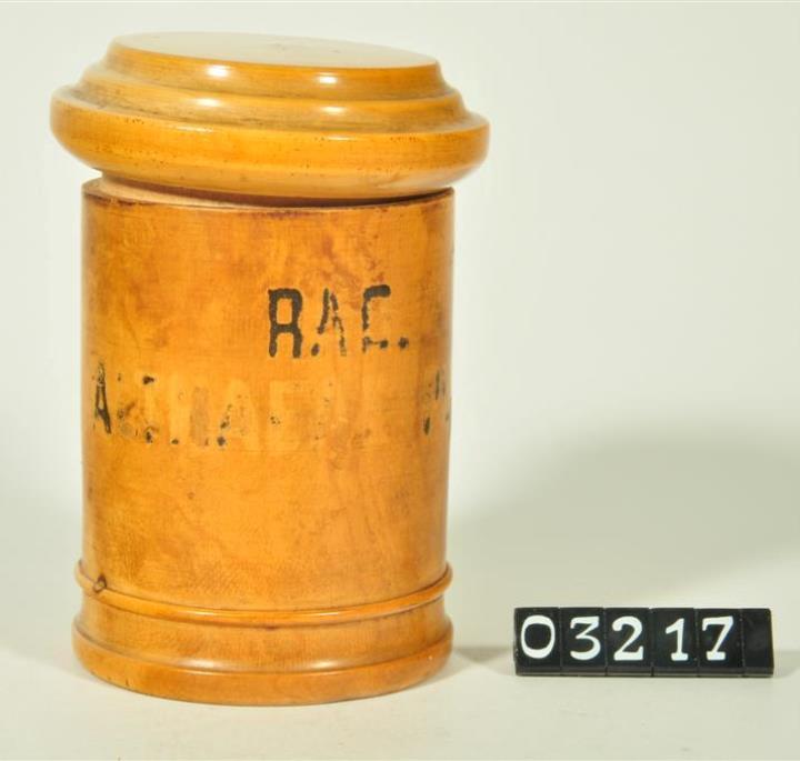 Hellbraune, zylinderförmige Holzdose (Holzbüchse) mit abgesetztem Standfuß bestehend aus Halbrundstab, Kehlung und geradem Abschluss. Flacher Stülpdeckel mit gerundetem Deckelrand und darüber zwei Kehlungen. Schwarz signiert