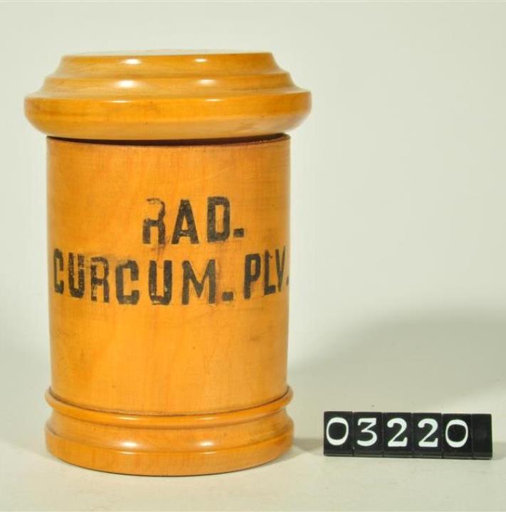 Hellbraune, zylinderförmige Holzdose (Holzbüchse) mit abgesetztem Standfuß bestehend aus Halbrundstab, Kehlung und geradem Abschluss. Flacher Stülpdeckel mit gerundetem Deckelrand und darüber zwei Kehlungen. Schwarz signiert