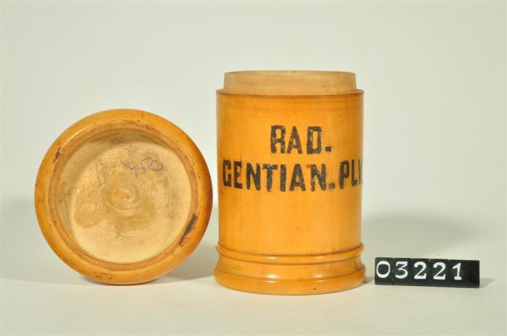 Hellbraune, zylinderförmige Holzdose (Holzbüchse) mit abgesetztem Standfuß bestehend aus Halbrundstab, Kehlung und geradem Abschluss. Flacher Stülpdeckel mit gerundetem Deckelrand und darüber zwei Kehlungen. Schwarz signiert.
