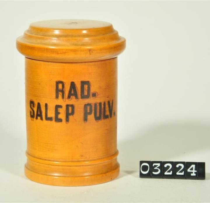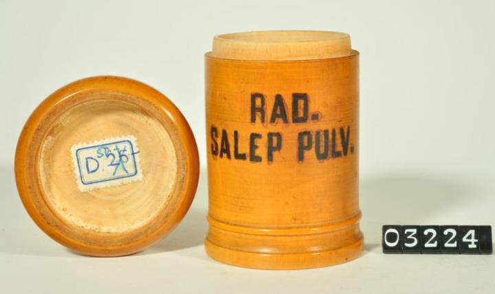 Hellbraune, zylinderförmige Holzdose (Holzbüchse) mit abgesetztem Standfuß bestehend aus Halbrundstab, Kehlung und geradem Abschluss. Flacher Stülpdeckel mit gerundetem Deckelrand und darüber zwei Kehlungen. Schwarz signiert