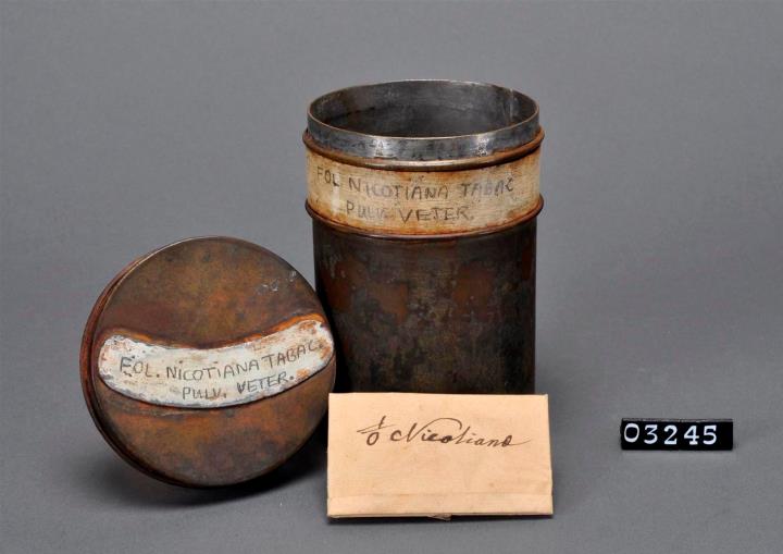 Zylinderförmige Blechdose mit abnehmbarem, weißem Beschriftungsband. Flacher Stülpdeckel mit ebenfalls abnehmbarem, ehemals weißem Beschriftungsband. Darin Pulver und zusätzlich ein Briefchen mit Pulvis Nicotiana, beschriftet von Ignaz Peer I (?). Beschriftungsbänder mit Bleistift signiert von Elisabeth Fehrenbach-Peer. Enthält Tabakpulver.