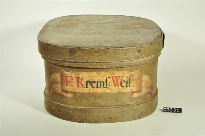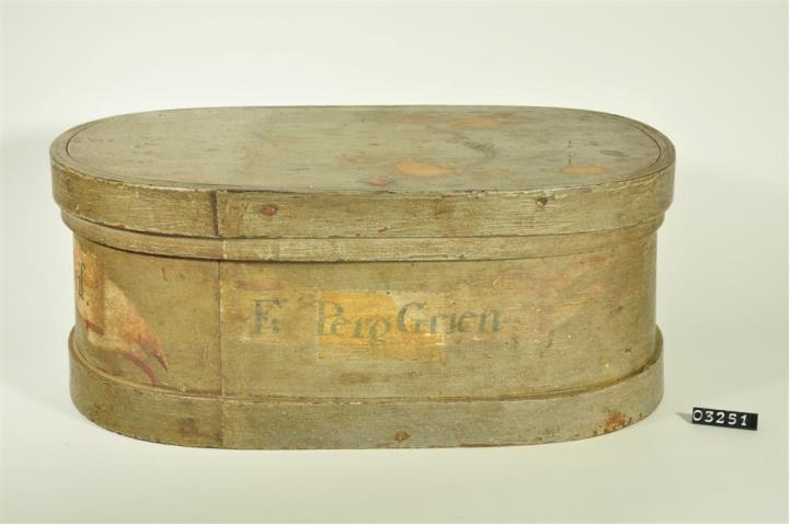 Hellgrüne, ovale Spanschachtel mit flachem Stülpdeckel. Boden und Deckel aus Massivholz, Seitenteile aus Spanholz (Furnier). Auf der Stirnseite weiße Beschriftungsbanderole. Rot und schwarz signiert. An der Breitseite einfach gestaltete Beschriftung »F. Perg Grien«. Inhalt ein verpackter Kegel Kremser Weiss.