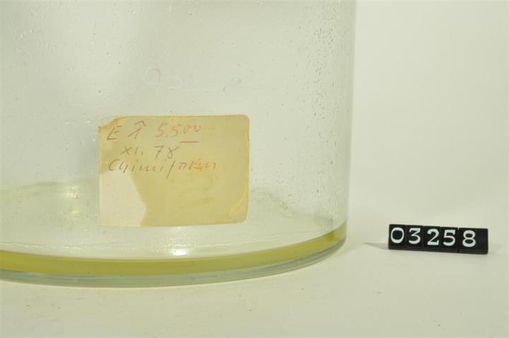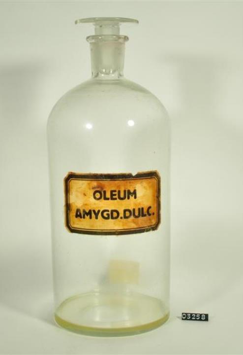 Farblose, zylindrische Enghalsflasche mit Schliffstopfen. Mit Signierapparat bedrucktes Papierschild, achteckig, mit schwarzem Doppelrand und schwarzer Schrift auf ehemals weißem Grund. Mit Schilderlack überzogen.