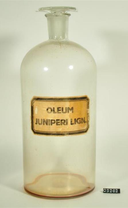 Farblose, zylindrische Enghalsflasche mit Schliffstopfen für Wacholderholzöl. Mit Signierapparat bedrucktes Papierschild, achteckig, mit schwarzem Doppelrand und schwarzer Schrift auf ehemals weißem Grund. Mit Schilderlack überzogen.