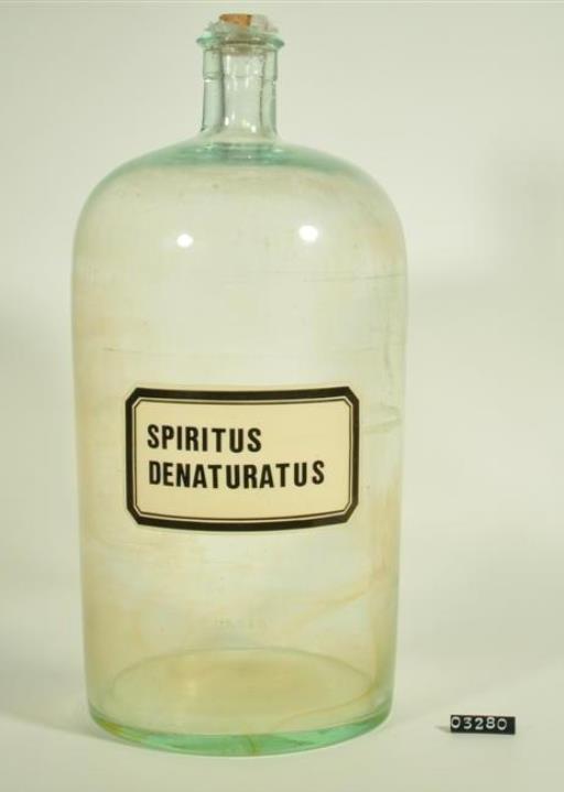 Zylindrischer Flaschenkörper aus farblosem Glas. Manuell aufgesetzter Hals mit nachgearbeitetem Mündungsrand. Mit Abreibe Buchstaben beschriftetes und mit Klarsichtfolie überzogenes Papierschild, achteckig, mit schwarzem Doppelrand und schwarzer Schrift auf weißem Grund. Enthielt vergällten Alkohol.