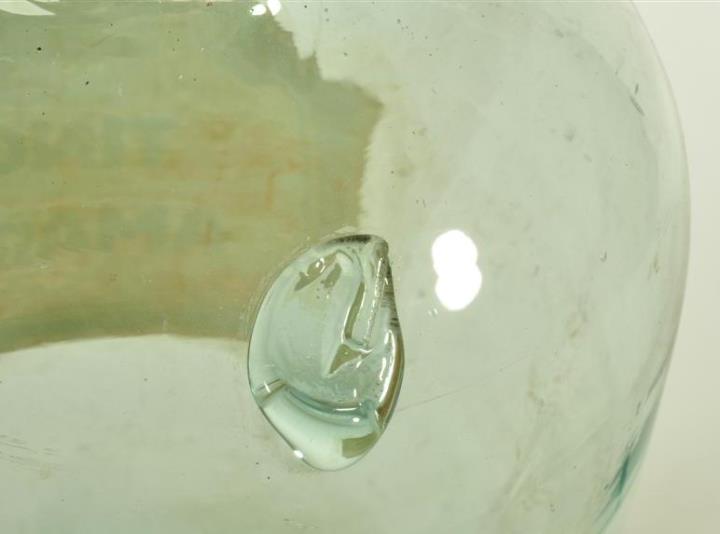 Zylinderförmige, leicht grünstichige Glasflasche mit Lufteinschlüssen. Manuell aufgesetzter Hals. Mündungsrand mit umgelegtem Glasfaden. Kork mit Rezepturfaden gesichert. Nach oben gewölbter Boden. Auf der Schulter aufgeschmolzene Glasmarke mit Volumenangabe in Liter. Mit Signierapparat bedrucktes Papierschild, achteckig, mit schwarzem Doppelrand und schwarzer Schrift auf ehemals weißem Grund. Mit Schilderlack überzogen. Größe: 135 x 75 mm. Enthielt Bittere Tinktur.