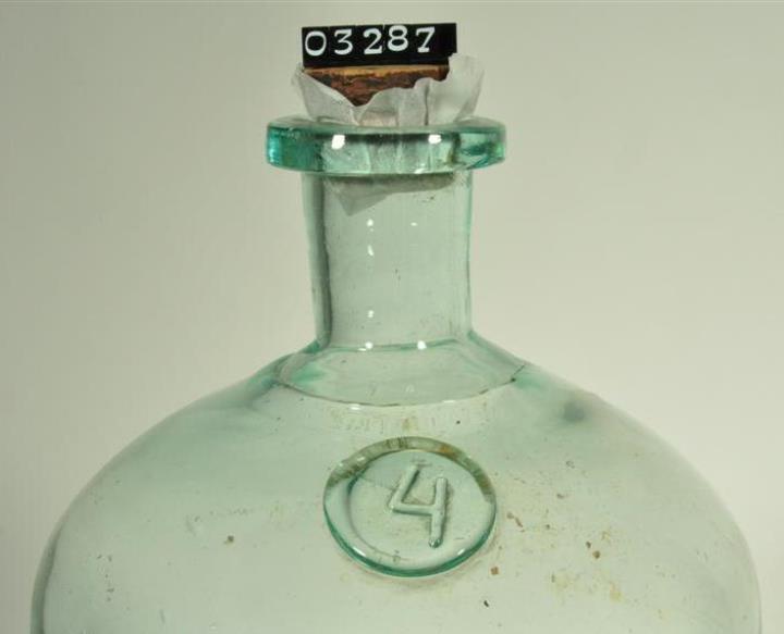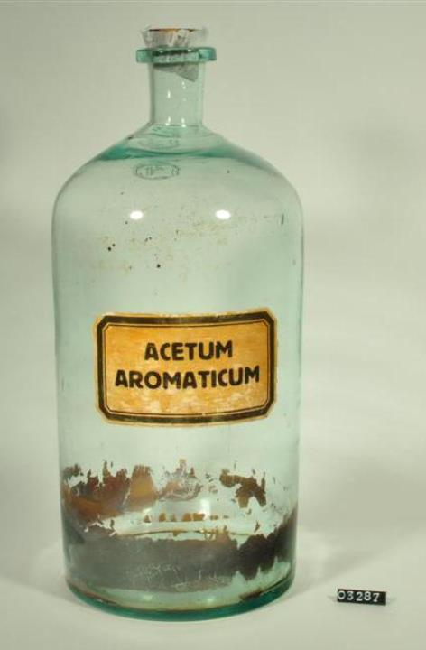 Zylinderförmige, leicht grünstichige Glasflasche mit Lufteinschlüssen. Manuell aufgesetzter Hals. Mündungsrand mit umgelegtem Glasfaden. Kork. Nach oben gewölbter Boden. Auf der Schulter aufgeschmolzene Glasmarke mit Volumenangabe in öserreichischem Maß. Mit Signierapparat bedrucktes Papierschild, achteckig, mit schwarzem Doppelrand und schwarzer Schrift auf ehemals weißem Grund. Mit Schilderlack überzogen. Größe: 135 x 75 mm. Enthielt Kräuteressig.