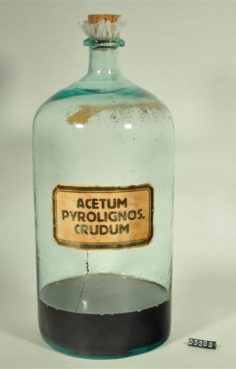 Zylinderförmige, grünstichige Glasflasche mit Lufteinschlüssen. Manuell aufgesetzter Hals. Mündungsrand mit umgelegtem Glasfaden. Mit Kork verschlossen. Nach oben gewölbter Boden. Auf der Schulter aufgeschmolzene Glasmarke mit Volumenangabe in österreichischem Maß. Mit Signierapparat bedrucktes Papierschild, achteckig, mit schwarzem Doppelrand und schwarzer Schrift auf ehemals weißem Grund. Mit Schilderlack überzogen. Größe: 135 x 75 mm. Enthält rohen Holzessig.