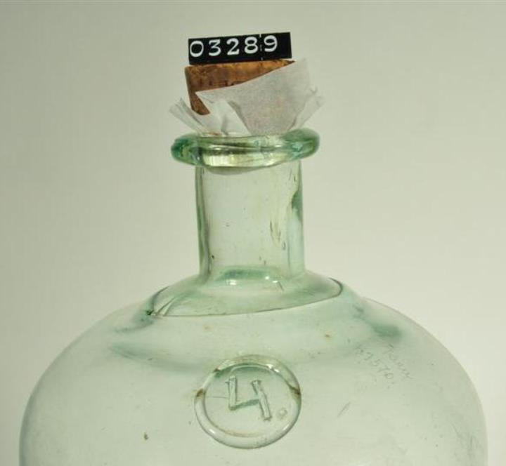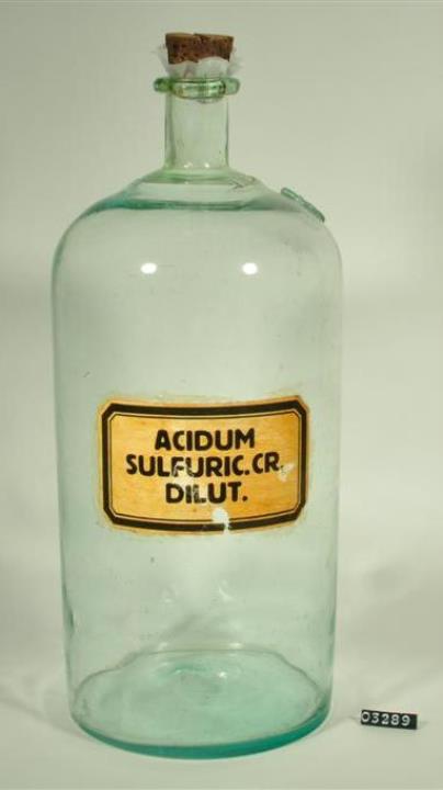 Zylinderförmige, leicht grünstichige Glasflasche mit Lufteinschlüssen. Manuell aufgesetzter Hals. Mündungsrand mit umgelegtem Glasfaden. Mit Kork verschlossen. Nach oben gewölbter Boden. Auf der Schulter aufgeschmolzene Glasmarke mit Volumenangabe in österreichischem Maß. Mit Signierapparat bedrucktes Papierschild, achteckig, mit schwarzem Doppelrand und schwarzer Schrift auf ehemals weißem Grund. Mit Schilderlack überzogen. Enthielt verdünnte rohe Schwefelsäure.