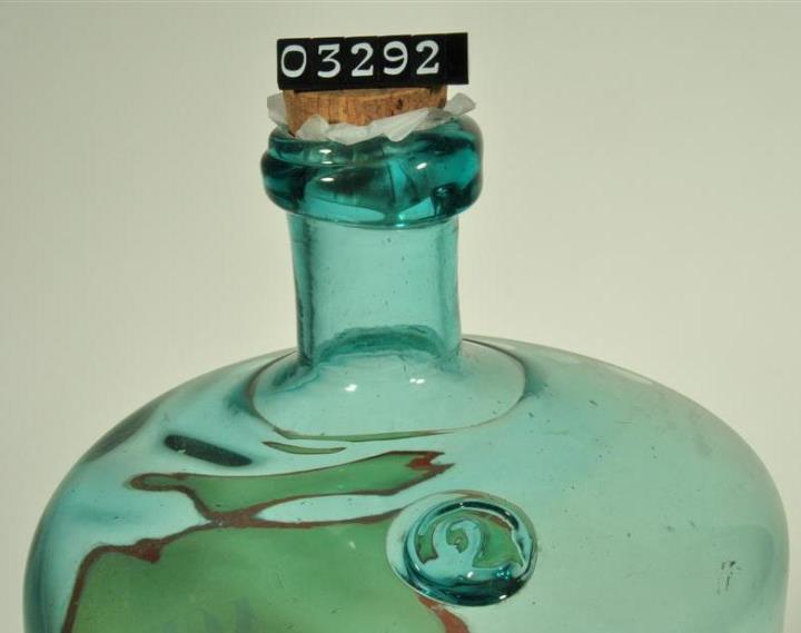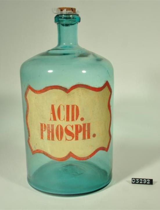 Zylinderförmige, blaugrüne, mundgeblasene Glasflasche mit kleinen Lufteinschlüssen. Manuell aufgesetzter Hals. Mündungsrand mit umgelegtem Glasfaden. Mit Kork verschlossen. Nach oben gewölbter Boden mit Hefteisenabriss. Auf der Schulter aufgeschmolzene Glasmarke mit Volumenangabe in österreichischem Maß. Handgeschriebene Signatur auf rotumrandetem, geschwungenem und anschließend eingebranntem Schild. Rote Schrift auf weißem Grund. Enthielt Phosphorsäure.