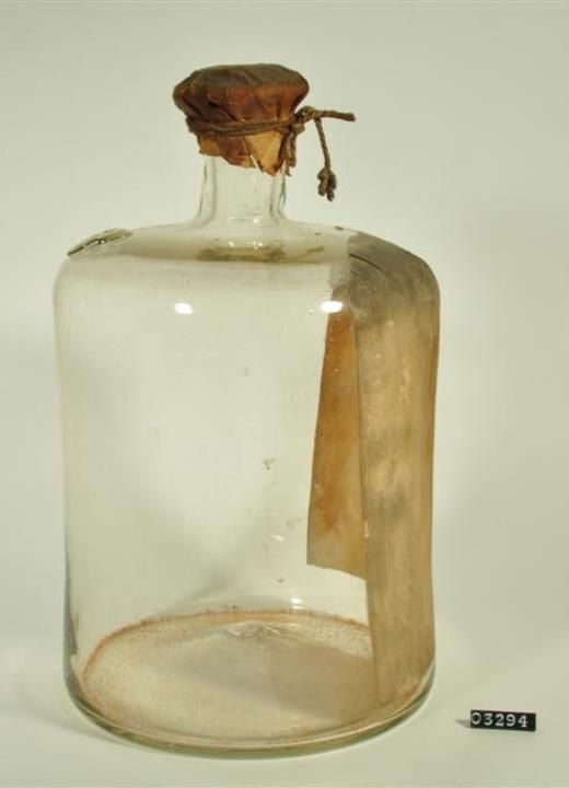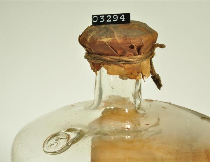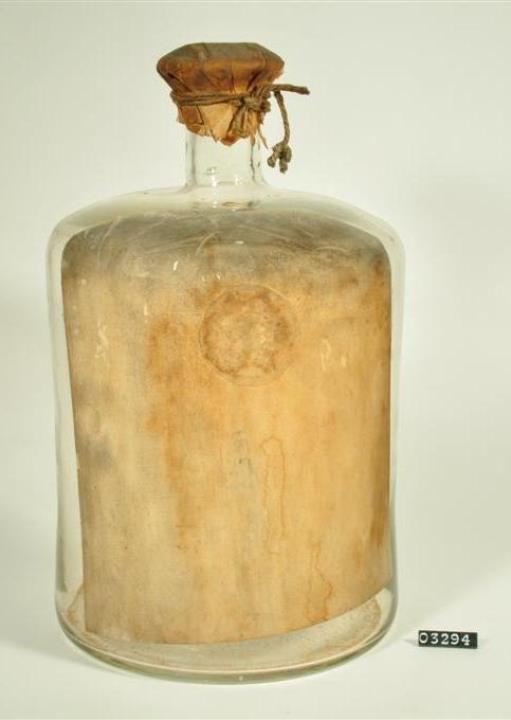 Zylinderförmige, farblose, mundgeblasene Glasflasche mit flacher Schulter. Manuell aufgesetzter Hals. Mit Kork und einer Papiertektur verschlossen. Nach oben gewölbter Boden mit Hefteisenabriss. Auf der Schulter aufgeschmolzene Glasmarke mit Volumenangabe in österreichischem Maß. Gravur an der Schulter. Höchstwahrscheinlich 1893 kaputtgegengen und durch Aufkleben von Papier repariert. Auf der Tektur steht die Jahrzahl 1893.