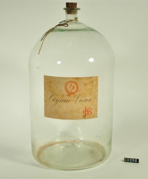 Zylinderförmige, farblose, mundgeblasene dünne Glasflasche mit hochgezogener Schulter. Manuell aufgesetzter Hals. Mündungsrand mit aufgeschmolzenem Glasfaden. Mit Kork verschlossen. Nach oben gewölbter Boden mit Hefteisenabriss. Eingravierte Tara an der Schulter (1 0/4 Pfund). Aufgeklebtes bedrucktes Schild. Enthielt Medizinalcognac.