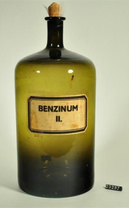 Zylinderförmige, olivgrüne Glasflasche. Industriell hergestellt. Mündungsrand mit umgelegtem Glasfaden. Mit Kork verschlossen. Nach oben gewölbter Boden. Auf der Schulter aufgeschmolzene Glasmarke mit Volumenangabe in Liter. Mit Signierapparat bedrucktes und mit Schilderlack überzogenes Papierschild, achteckig, mit schwarzem Doppelrand und schwarzer Schrift auf weißem Grund. Auf der Rückseite gezahntes Schild mit der Tara. Enthielt Wundbenzin.