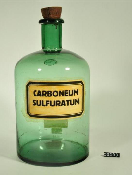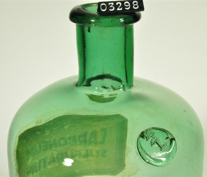 Zylinderförmige, grüne Glasflasche. Mundgeblasen, manuell aufgesetzter Hals und Mündungsrand mit umgelegtem Glasfaden. Mit Kork verschlossen. Nach oben gewölbter Boden mit großem Hefteisenabriß. Auf der Schulter aufgeschmolzene Glasmarke mit Volumenangabe in Liter. Mit Signierapparat bedrucktes und mit Schilderlack überzogenes Papierschild, achteckig, mit schwarzem Doppelrand und schwarzer Schrift auf weißem Grund. Auf der Rückseite gezahntes Schild mit der Tara und Schild mit Produktnamen, maschienengeschrieben von Ignaz Peer II. Beide mit Schilderlack überzogen. Enthielt Schwefelalkohol (Schwefelkohlenstoff).