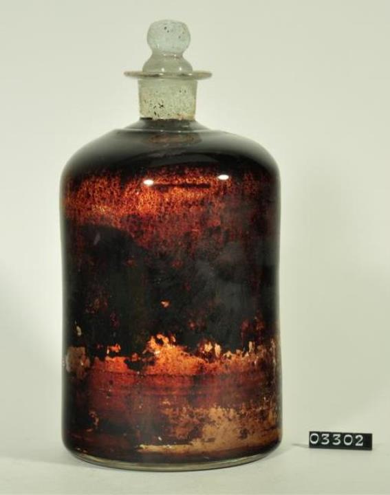 Zylindrische, leicht eingebauchte mundgeblasene Flasche mit flacher Schulter aus farblosem Glas. Schliffstopfen mit rundem Knauf. Manuell aufgesetzter Hals, Mündung mit aufgelegtem Halsfaden, abgeflachtes Profil. Leicht eingewölbter Boden mit Hefteisenabriß. Unsigniert. Unbekannter Inhalt.