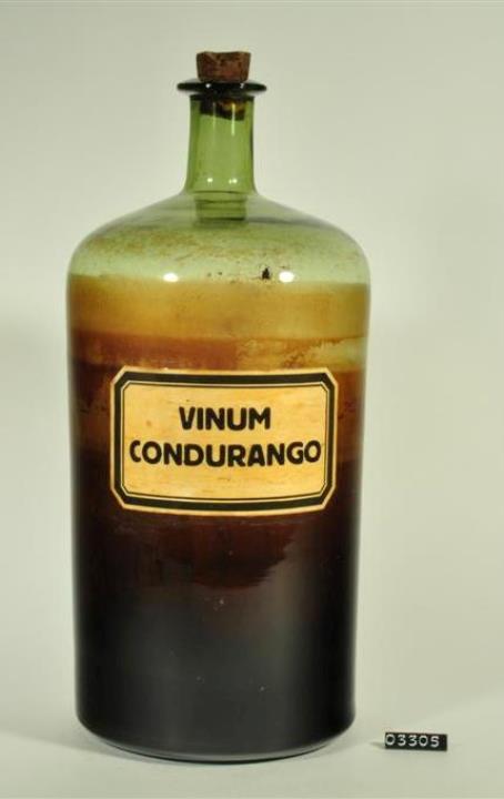 Zylinderförmige, grüne Glasflasche mit Lufteinschlüssen. Flachere Schulter. Maschinell hergestellt, manuell aufgesetzter Hals mit nachgearbeitetem Mündungsrand. Mündungsrand mit umgelegtem Glasfaden. Mit Kork verschlossen. Nach oben gewölbter Boden. Mit Signierapparat bedrucktes Papierschild, achteckig, mit schwarzem Doppelrand und schwarzer Schrift auf ehemals weißem Grund. Mit Schilderlack überzogen. Enthielt Kondurangowein.