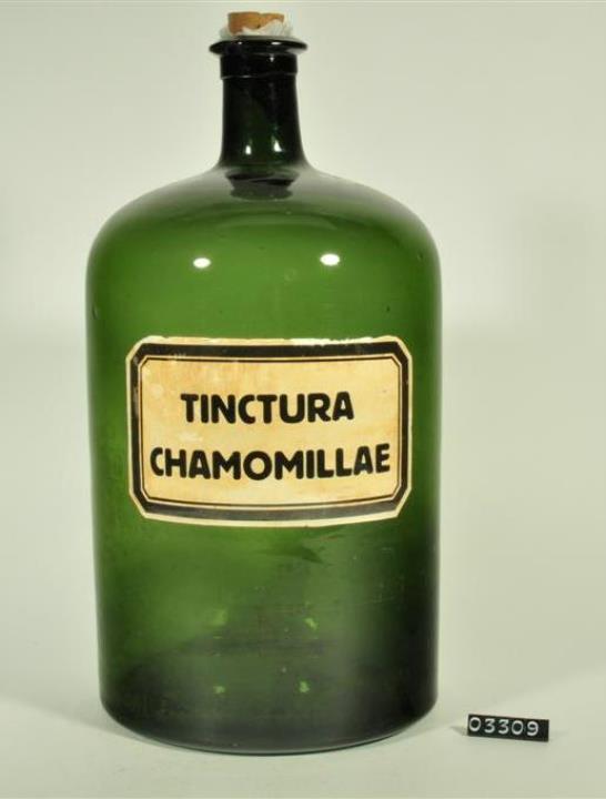 Zylinderförmige, grüne Glasflasche. Maschinell hergestellt, manuell aufgesetzter Hals mit nachgearbeitetem Mündungsrand. Mündungsrand mit umgelegtem Glasfaden. Mit Kork verschlossen. Nach oben gewölbter Boden. Mit Signierapparat bedrucktes Papierschild, achteckig, mit schwarzem Doppelrand und schwarzer Schrift auf ehemals weißem Grund. Mit Schilderlack überzogen. Rückseite Tara mit Nagellack vermerkt. Enthielt Kamilltentinktur.
