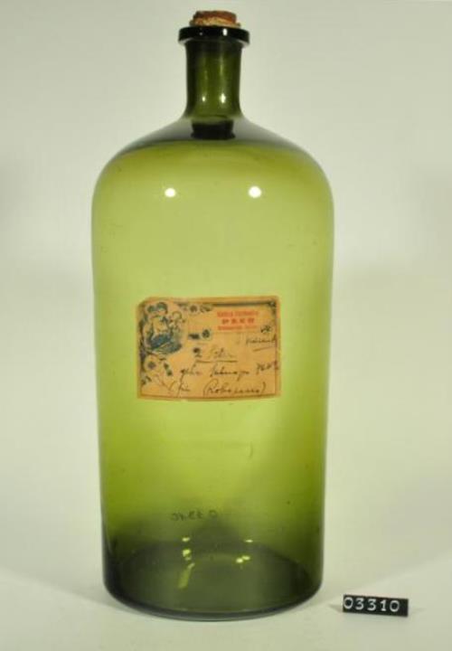 Zylinderförmige, grüne Glasflasche mit Lufteinschlüssen. Maschinell hergestellt, manuell aufgesetzter Hals mit nachgearbeitetem Mündungsrand. Mündungsrand mit umgelegtem Glasfaden. Mit Kork verschlossen. Nach oben gewölbter Boden. Verziertes Etikett der Antica Farmacia Peer, beschriftet von Ignaz Peer II. Enthielt zwei Liter gebrannten Schnaps 76%.