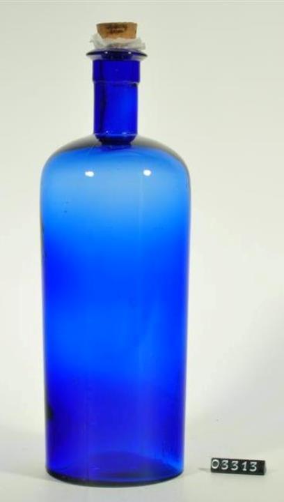 Blaue, zylindrische Glasflasche. Maschinell hergestellt, manuell aufgesetzter Hals mit nachgearbeitetem Mündungsrand. Unterschiedliche Wandstärke. Seitliche Naht. Boden leicht nach oben gewölbt mit Stern als Mittelpunkt. Mit Kork verschlossen.