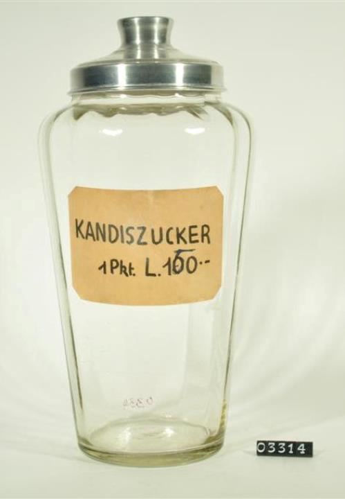 Nach unten konisch zulaufendes farbloses Bonbonglas. Aussenwand glatt, innen längs gerippt. Stülpeckel aus Blech mit Knauf. Beschriftet von Toni Kerer. Enthielt Kandiszucker.