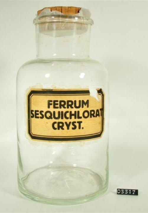Zylindrischer, mundgeblasener, farbloser Glaskörper mit weiter Mündung (Pulverglas). Mündungsrand mit umgelegtem Glasfaden. Boden eingewölbt mit großem Hefteisenabriss. Mit Kork verschlossen. Signiert. Enthielt Eisen(III)-chlorid.