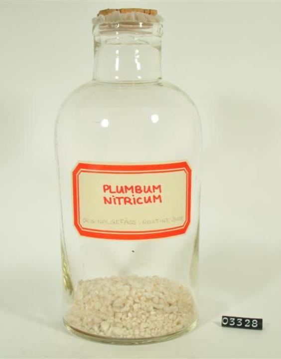 Zylinderförmiger, maschinell hergestellter farbloser Glaskörper. Weite Mündung mit umgelegtem Glasfaden. Mit Signierapparat bedrucktes Papierschild, achteckig, mit rotem Doppelrand und roter Schrift auf ehemals weißem Grund. Beschriftet und umgefüllt von Elisabeth Fehrenbach-Peer. Enthält Bleinitrat.