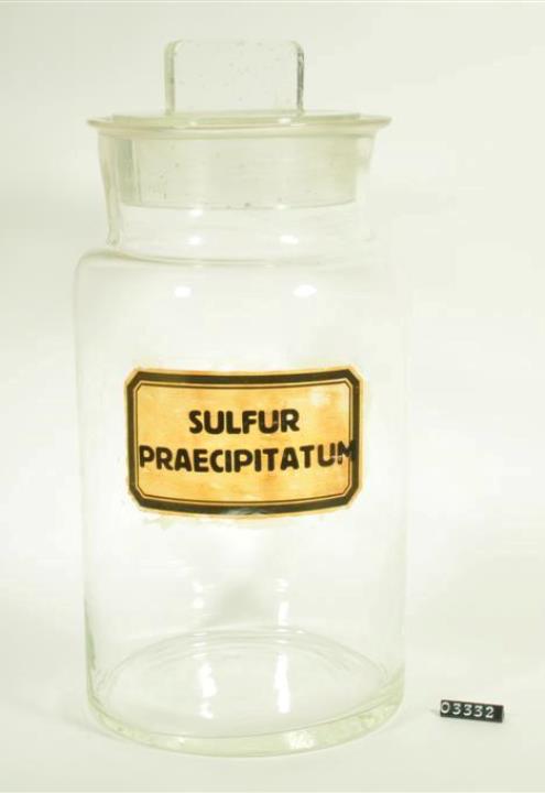 Zylindrischer, farbloser Flaschenkörper (Weithalsflasche) mit kleiner Schulter. Maschinell hergestellt, manuell aufgesetzter Hals, Mündungsrand ausgebogen. Schliffstopfen mit flachem Knauf. Signiert. Mit Signierapparat bedrucktes Papierschild, achteckig, mit schwarzem Doppelrand und schwarzer Schrift auf ehemals weißem Grund. Mit Schilderlack überzogen. Enthält Sulfur praecipitatum = gefällter Schwefel.