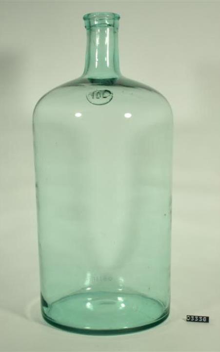 Zylinderförmige, grünstichige Glasflasche mit mit leicht gewellter Oberfläche. Maschinell hergestellt, manuell aufgesetzter, unwuchtiger Hals, Mündungsrand mit umgelegtem Glasfaden. Nach oben gewölbter Boden, unebener Standring. Auf der Schulter aufgeschmolzene Glasmarke, Durchmesser 36 mm, mit Volumenangabe in Liter. An der Schulter eingaviertes Taragewicht (3.1).