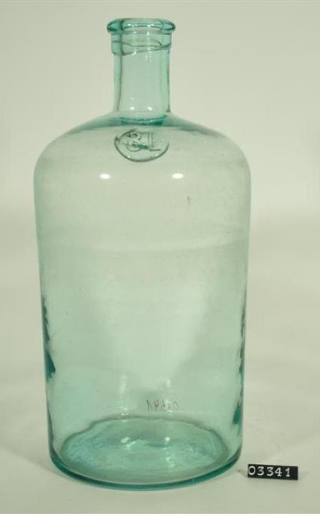 Zwei zylinderförmige, grünstichige Glasflaschen mit mit leicht gewellter Oberfläche und vielen kleinen Lufteinschlüssen. Manuell aufgesetzter Hals mit nachgearbeitetem Mündungsrand mit umgelegtem Glasfaden. Nach oben gewölbter Boden mit nicht ganz planem Standring. Auf der Schulter aufgeschmolzene Glasmarke, Durchmesser 35 mm, mit Volumenangabe in Liter.