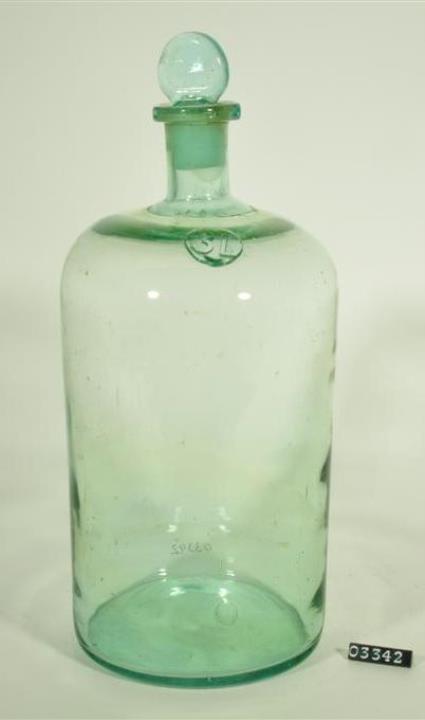 Zylinderförmige, grünstichige Glasflasche mit mit leicht gewellter Oberfläche und vielen kleinen Lufteinschlüssen. Manuell aufgesetzter Hals mit nachgearbeitetem Mündungsrand mit umgelegtem Glasfaden. Mündung geschliffen. Schliffstopfen mit flachem Knauf. Nach oben gewölbter Boden mit planem Standring. Auf der Schulter aufgeschmolzene Glasmarke, Durchmesser 30 mm, mit Volumenangabe in Liter.