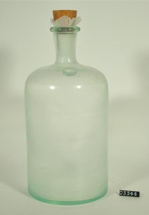 Zylinderförmige, farblose, mundgeblasene Glasflasche mit mit leicht gewellter Oberfläche. Manuell aufgesetzter Hals mit nachgearbeitetem Mündungsrand mit umgelegtem Glasfaden. Nach oben gewölbter Boden mit großem Hefteisenabriss und fast planem Standring. Auf der Schulter aufgeschmolzene Glasmarke, Durchmesser 24 mm, mit eingravierter Volumenangabe in Liter. Innenwand milchige Substanzreste.