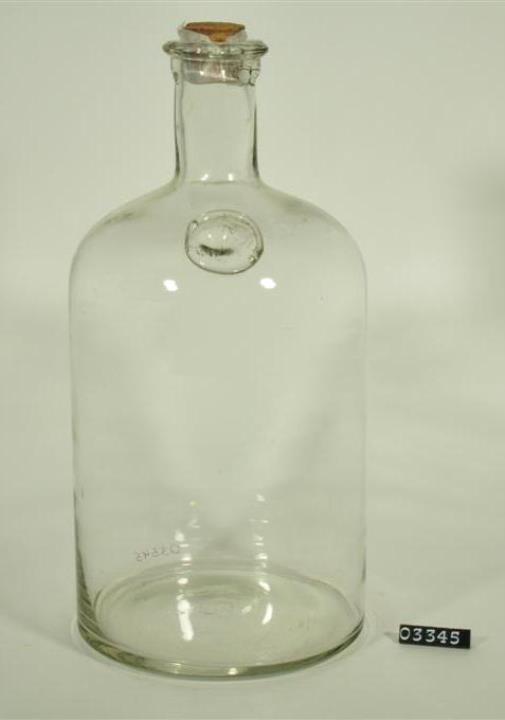 Zylinderförmige, farblose Glasflasche mit mit leicht gewellter Oberfläche. Manuell aufgesetzter Hals mit nachgearbeitetem Mündungsrand mit umgelegtem Glasfaden. Leicht nach oben gewölbter Boden, fast planer Standring. Auf der Schulter aufgeschmolzene Glasmarke, Durchmesser 33 mm, mit eingravierter Volumenangabe in Liter.