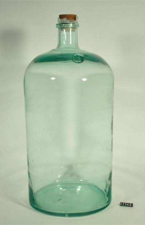 Zylinderförmige, grünstichige Glasflasche mit mit leicht gewellter Oberfläche. Manuell aufgesetzter Hals, nachbearbeiteter Mündungsrand mit umgelegtem Glasfaden. Nach oben gewölbter Boden, fast planer Standring. Auf der Schulter aufgeschmolzenes Glassiegel, gestempelt mit einer 8., 30 mm Ø. Volumenangabe in österreichischem Maß.