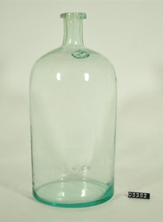 Zwei zylinderförmige, grünstichige Glasflaschen mit mit leicht gewellter Oberfläche. Manuell aufgesetzter Hals, nachbearbeiteter Mündungsrand mit umgelegtem Glasfaden. Leicht nach oben gewölbter Boden, fast planer Standring. Auf der Schulter aufgeschmolzenes Glassiegel, gestempelt mit einer 2, 26 mm Ø. Volumenangabe in österreichischem Maß. 3352-2 hochgestochener Boden mit Hefteisenabriß.