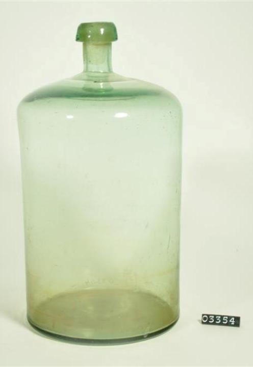 Zylinderförmige, grüne Glasflasche mit mit leicht gewellter Oberfläche. Manuell aufgesetzter Hals, nachbearbeiteter Mündungsrand mit umgelegtem Glasfaden. Flache Schulter. Leicht hochgestochener Boden mit Hefteisenabriß, fast planer Standring.