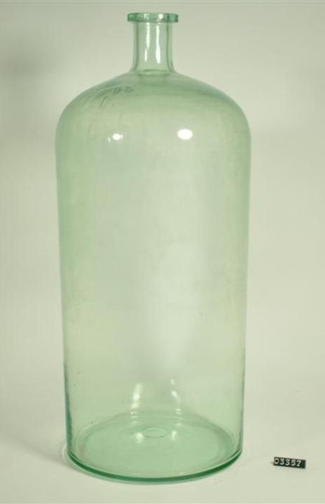 Zwei zylinderförmige, leicht grünstichige Glasflaschen mit mit leicht gewellter Oberfläche. Manuell aufgesetzter Hals, Mündungsrand mit umgelegtem Glasfaden. An der Schulter große Lufteinschlüsse. Leicht hochgewölbter Boden, fast planer Standring.